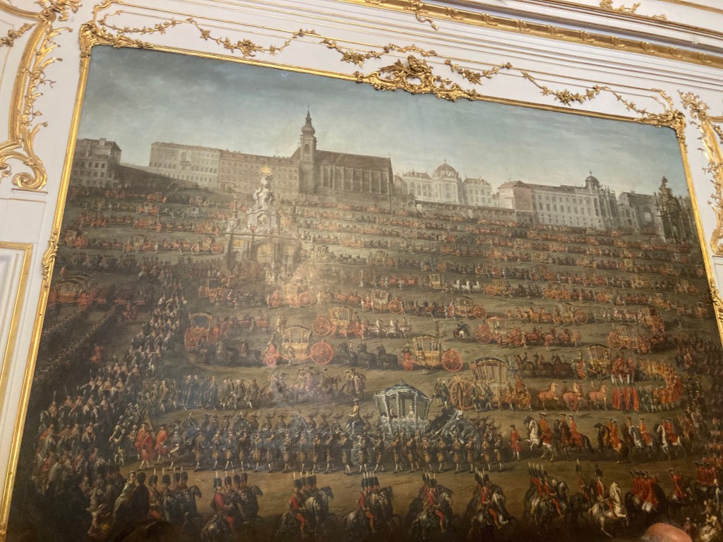 One of the most interesting paintings is a depiction of a royal wedding in 1760. I say so because The artist, Martin van Meytens, was asked to include Mozart in the picture, as Mozart had recently become a bit of a superstar. Mozart hadn’t actually been present at the wedding, so the painting displays one of the earliest examples of photoshop to include the little maestro in the frame.