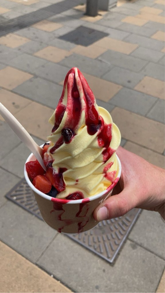 Then, knowing I’d need energy on the go, I hit up the Middle-Eastern section for a mix of sweet, roasted nuts, and a phat baklava roll. Their food was good but the market in general isn’t cheap. The guys selling nuts will also try to get you to buy way more than you wanted, so you just have to stand on bidness with them. That was my emergency snack boxed off, but I needed something to regulate my temperature in the day’s heat. Good thing I encountered the frozen yoghurt stand on my way out.