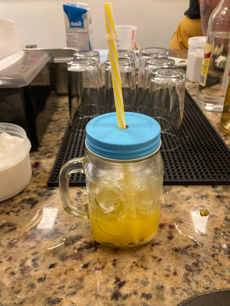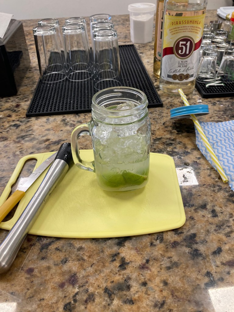 After our shots, we were each given a jar, a little bowl of (potentially brown) sugar, and a lime. The lime, I chopped in half and squeezed into the jar, along with two tablespoons of sugar. The next instruction was to take a pestle and mash the two together until the sugar was infused with lime-juice. Those steps complete, I poured in a double shot of cachaça, filled the jar halfway with ice, slapped the lid on, and shook it like it owed me money. Finally, I stuck a straw in to slurp what was easily the most perfect caipirinha I’d ever tried. I much prefer it with plenty of sugar, and no coconut milk for a sweet, soothing concoction.