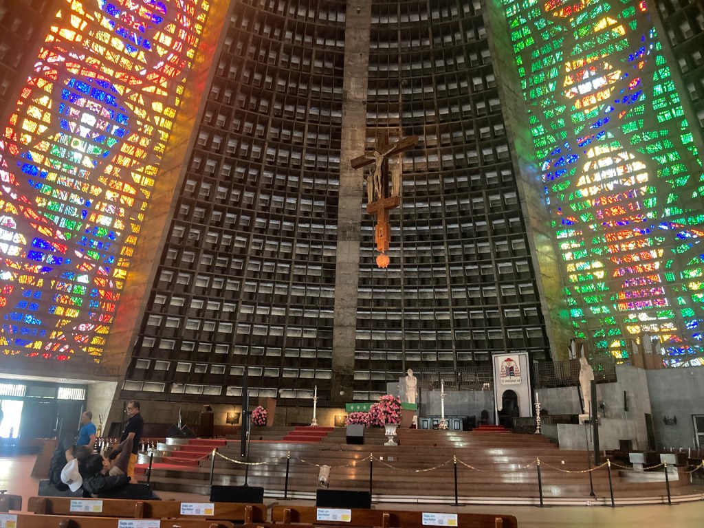 Near to it is the Catedral Metropolitana de São Sebastião. Now, I’ve laid eyes on a fair few metropolitan cathedrals in my time, but I’m hard-pressed to recall one on the scale of Rio’s. The awe-inspiring pyramid, despite being built half a century ago, appears futuristic even today. That’s just from outside. Indoors, it gets sexier. Three brightly-coloured towers of stained glass breathe life into the interior, combining with the soothing piano tune to transport you to a place of pure quietude. I took a seat and let my eyes absorb the central alter, the hanging sculpture of Christ on the cross, the old pipe organ and so on.