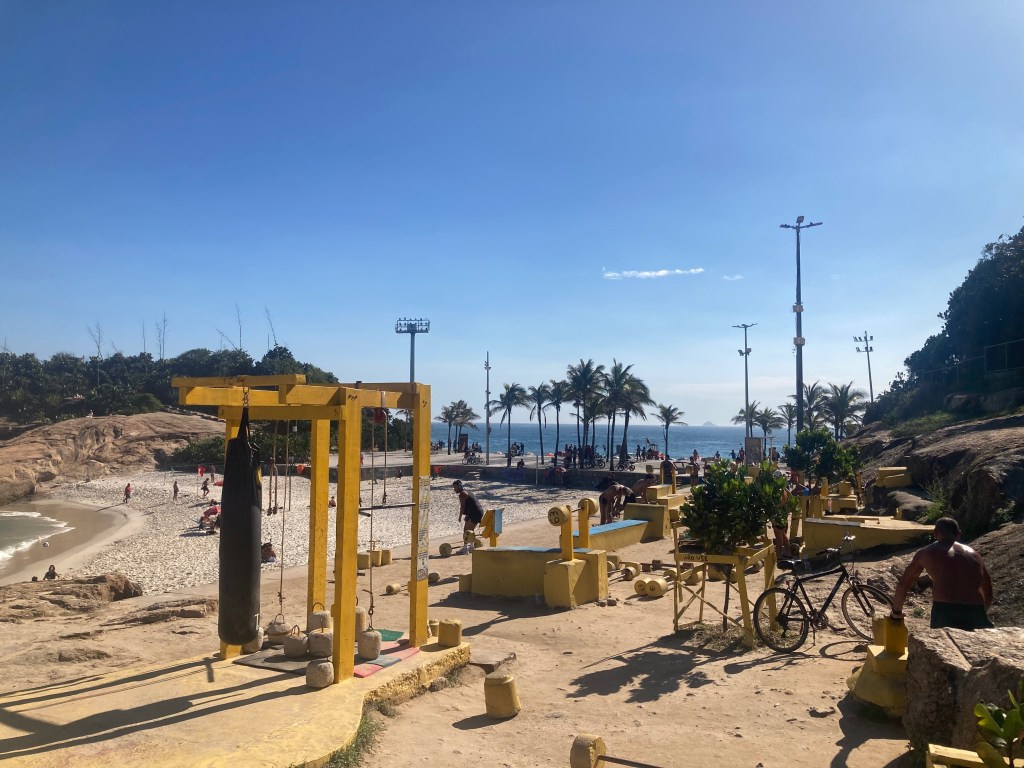 Those who had opted for a full-day tour stayed on the bus, but I got dropped off at Copacabana and went straight for Arpoador, in the corner between the Copa and Ipanema beaches. I wasn’t the only one who wanted to hit the sand, either. Blessed with good weather for the first time that week, citizens and visitors alike snatched their opportunity. Arpoador has a free outdoor gym right by the beach. All free weights are metal bars with lumps of concrete at the ends, and benches, pull-up bars and a little calisthenics apparatus are all at the public’s disposal. Everything you need to smash a good workout, with boatloads of scantily-clad women supplying that pre-workout caffeine.