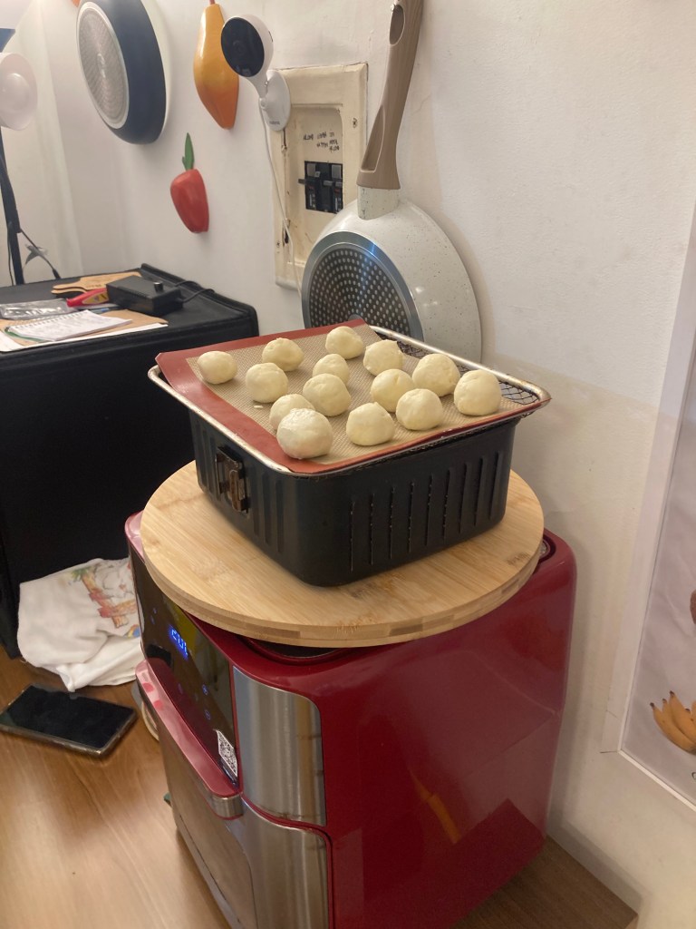 The air-fryer dinged and we took a break from cooking to wolf down tapioca and pão de queijo. We then boiled and ate some chopped cassava whilst the second batch of pão de queijo was baking.